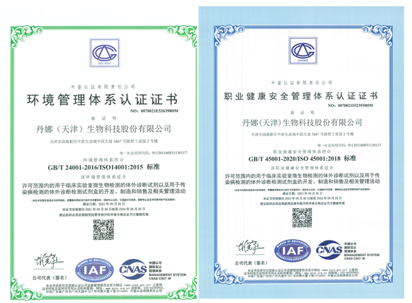 喜讯!丹娜生物喜获环境、职业健康安全管理体系认证证书