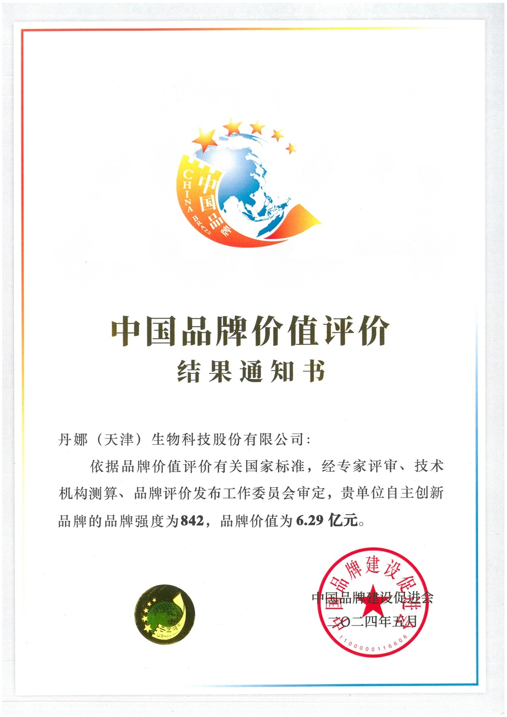 2024中国品牌价值评价证书