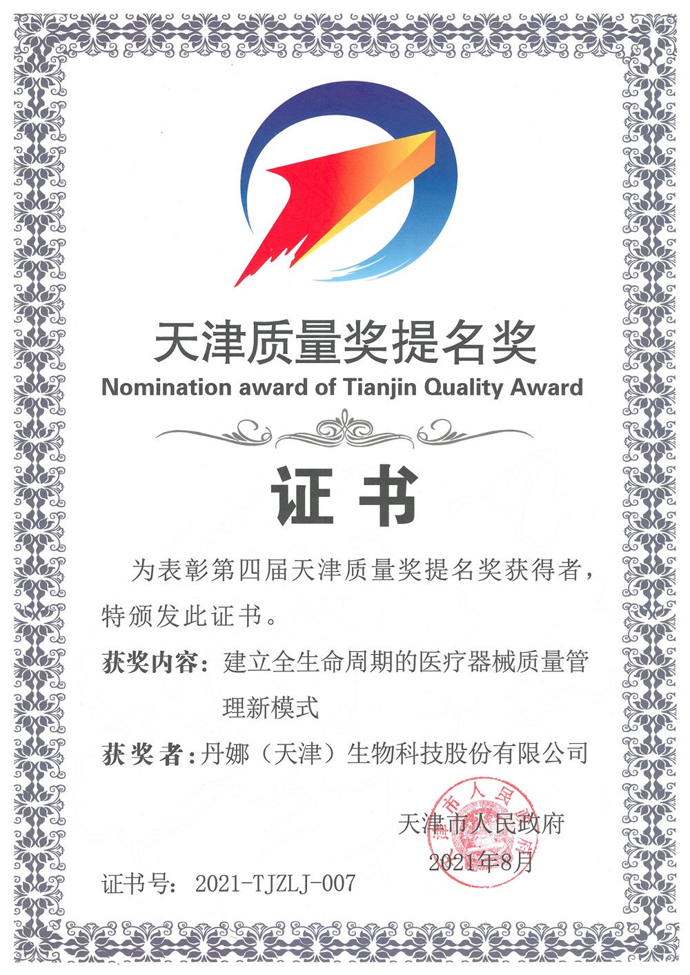 天津市质量奖提名奖证书